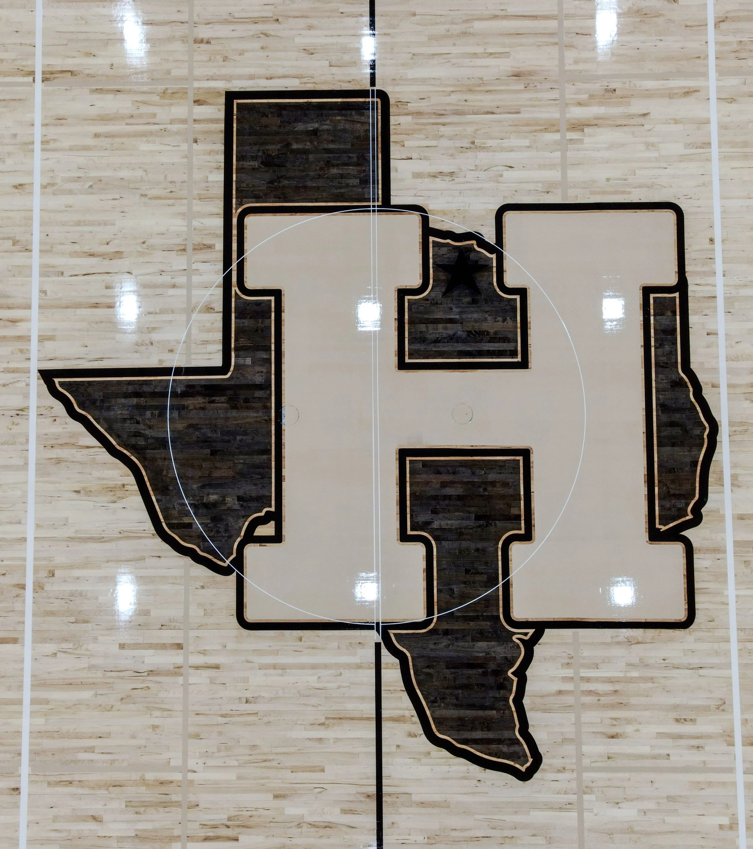 Indoor high school basketball court with light wood flooring, featuring a large black and red logo at center court, resembling the shape of Texas. The walls display multiple banners, and there are two basketball hoops at either end of the court. The